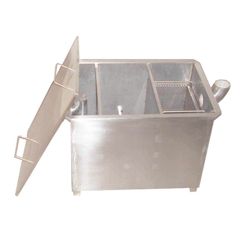 隔油池主要由兩槽'三槽'四槽分別組成,當(dāng)廚房排水流到第一槽時(shí),雜物框?qū)⑵渲械墓腆w雜物(菜葉等)截流除去,進(jìn)入第二槽后,利用油水密度差使油水分離。廢水沿第二槽隔油板向下流動(dòng),進(jìn)入第三槽后從物理裝置凈化流出,再經(jīng)出水管收集排出。第二槽中的油珠顆粒物沿隔油板集聚向上漂浮流動(dòng),始終浮在隔油池的第二槽內(nèi),經(jīng)過(guò)隔油處理的廢水則溢流入排水渠排出池外,進(jìn)行后續(xù)處理,以去除乳化油及其他污染物。