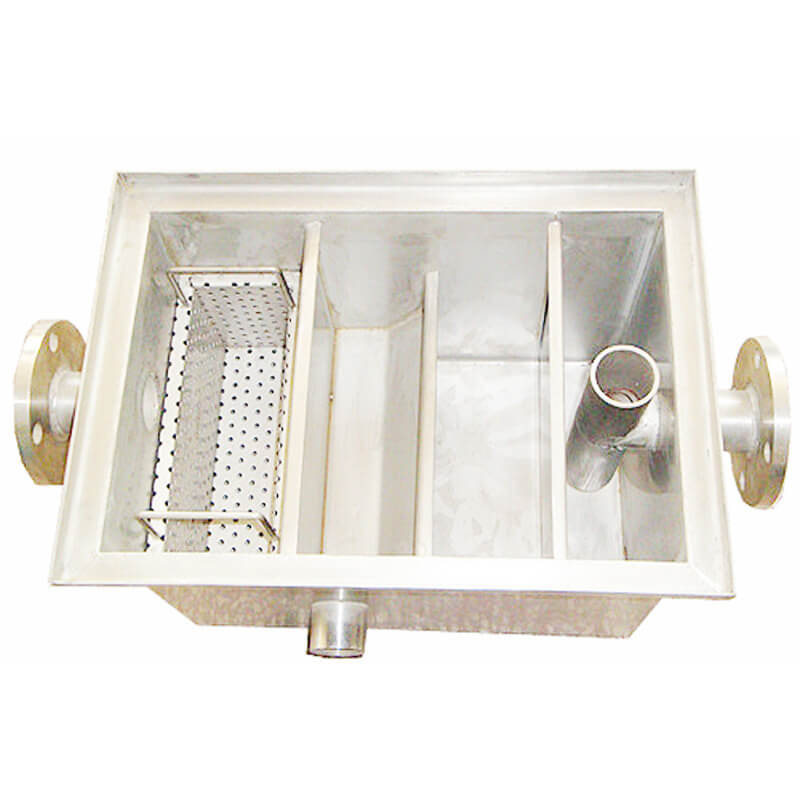隔油池主要由兩槽'三槽'四槽分別組成,當(dāng)廚房排水流到第一槽時,雜物框?qū)⑵渲械墓腆w雜物(菜葉等)截流除去,進(jìn)入第二槽后,利用油水密度差使油水分離。廢水沿第二槽隔油板向下流動,進(jìn)入第三槽后從物理裝置凈化流出,再經(jīng)出水管收集排出。第二槽中的油珠顆粒物沿隔油板集聚向上漂浮流動,始終浮在隔油池的第二槽內(nèi),經(jīng)過隔油處理的廢水則溢流入排水渠排出池外,進(jìn)行后續(xù)處理,以去除乳化油及其他污染物。